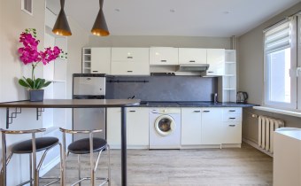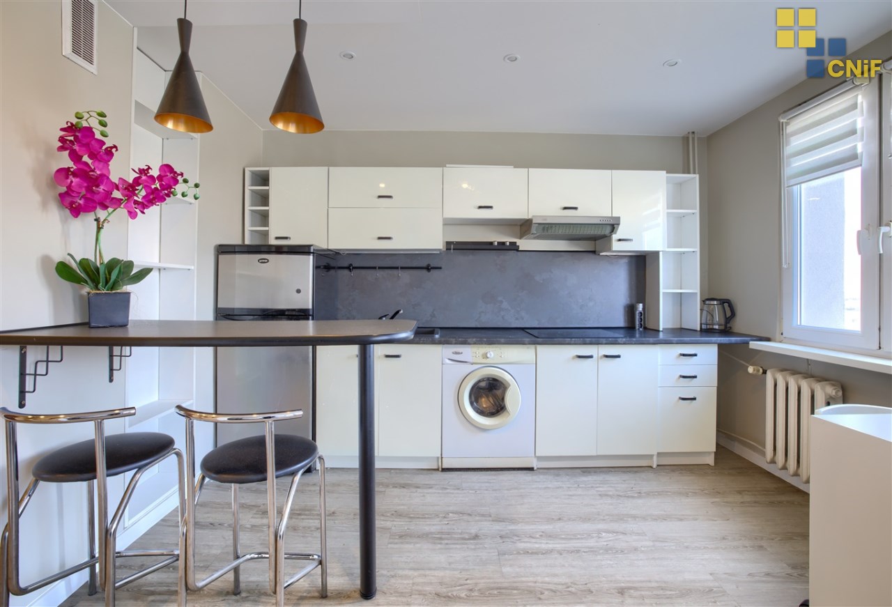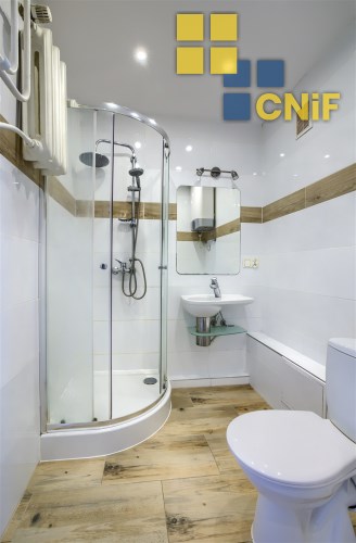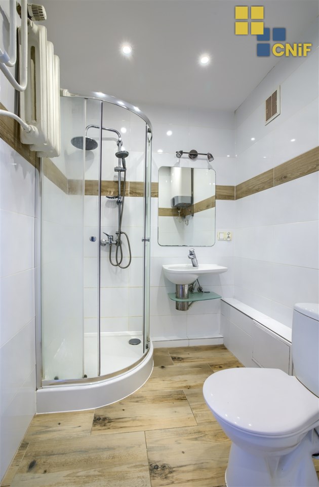 Kuchnia w zabudowie. Łazienka z kabiną prysznicową oraz nowoczesnym bojlerem dzięki czemu w mieszkaniu całkowicie zrezygnowano z gazu.