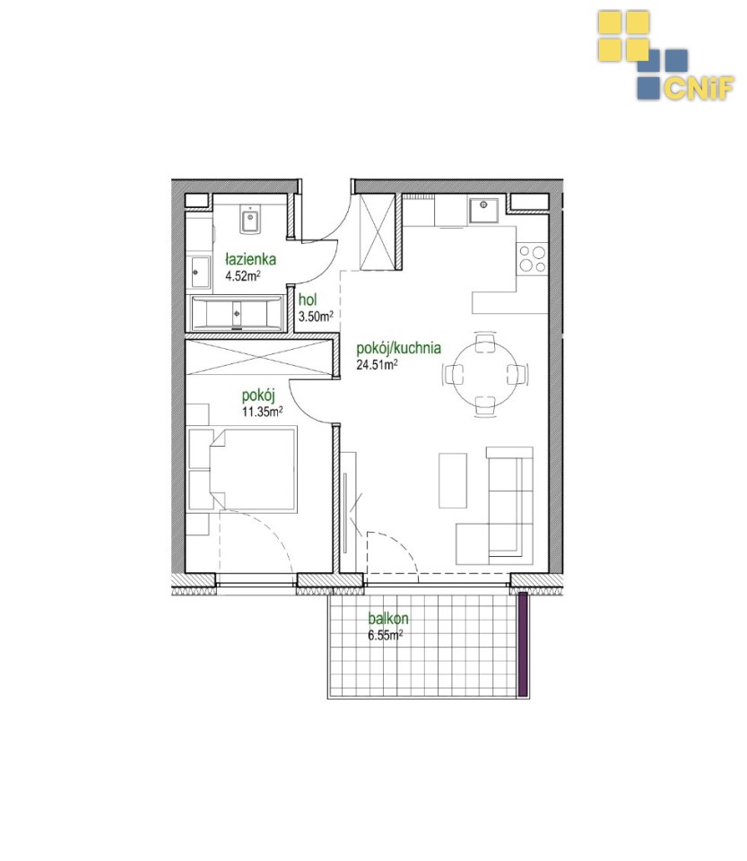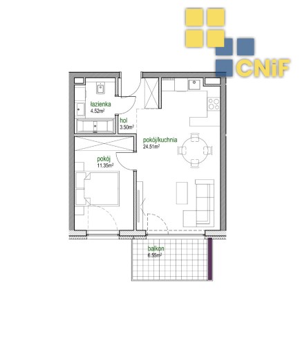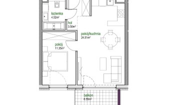 Lokal składa się z funkcjonalnego układu pomieszczeń, który zapewnia wygodę codziennego użytkowania oraz możliwość aranżacji według własnych potrzeb. Duży pokój z aneksem kuchennym, sypialnia, toaleta z WC.