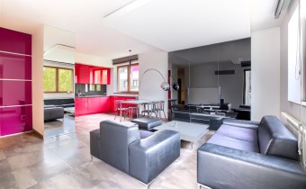 Przestronny, jasny salon połączony z nowoczesną, otwartą kuchnią, w pełni urządzoną i wyposażoną.