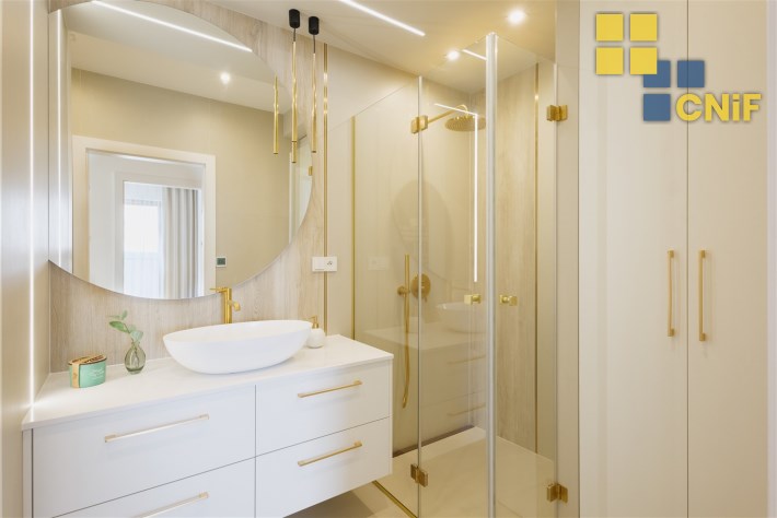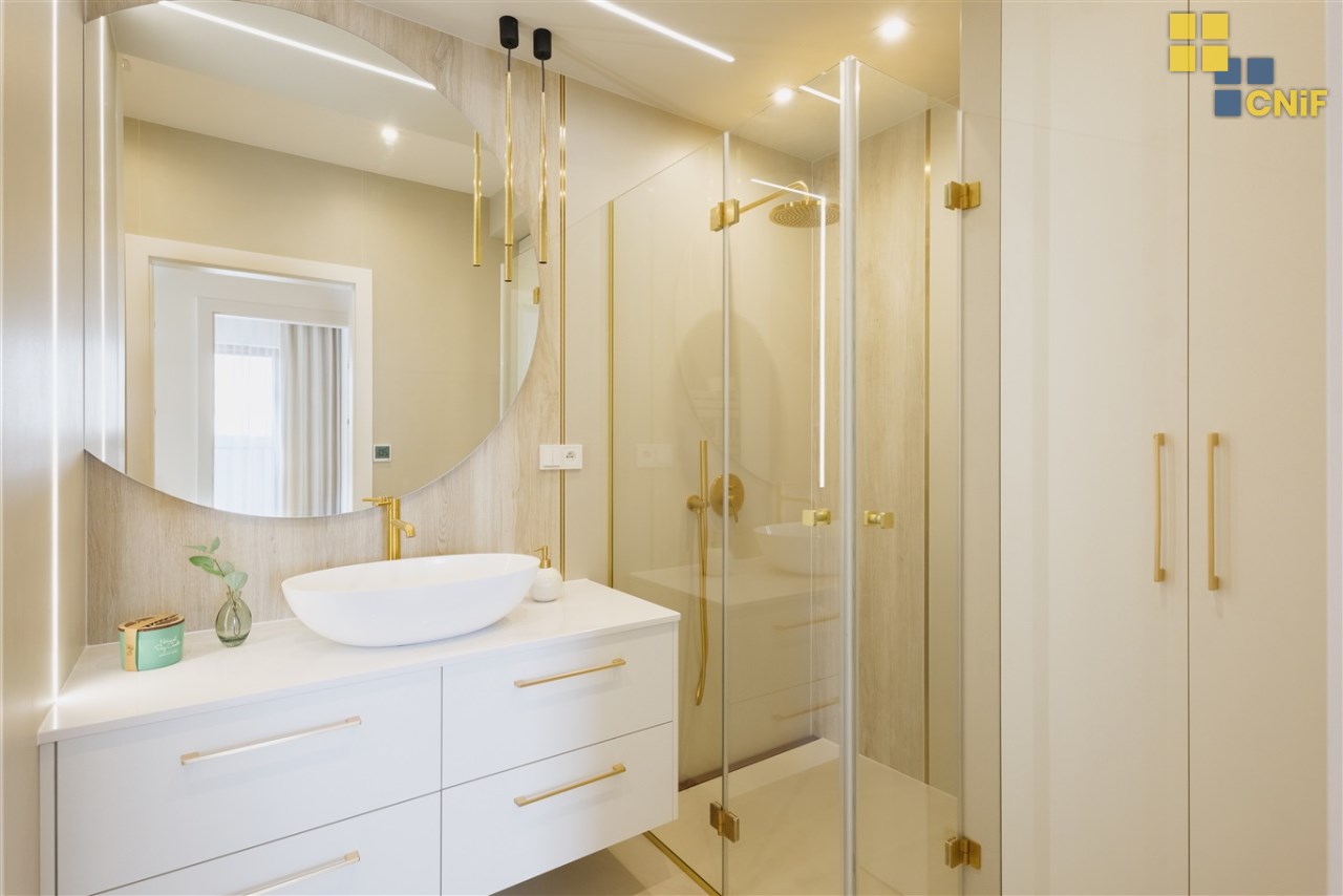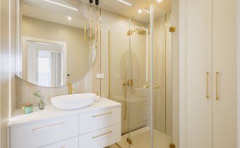 • dużej łazienki z kabiną prysznicową, w której znajduje się również pralka i suszarka ukryte w eleganckiej zabudowie,