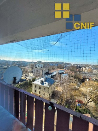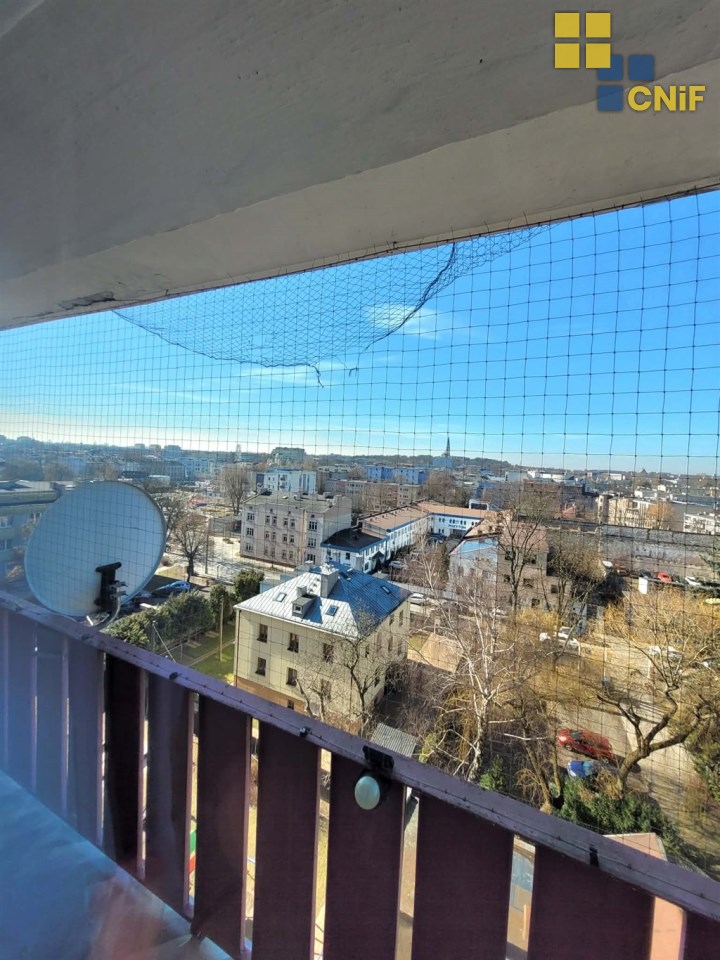 Duży balkon z widokiem na panoramę miasta.