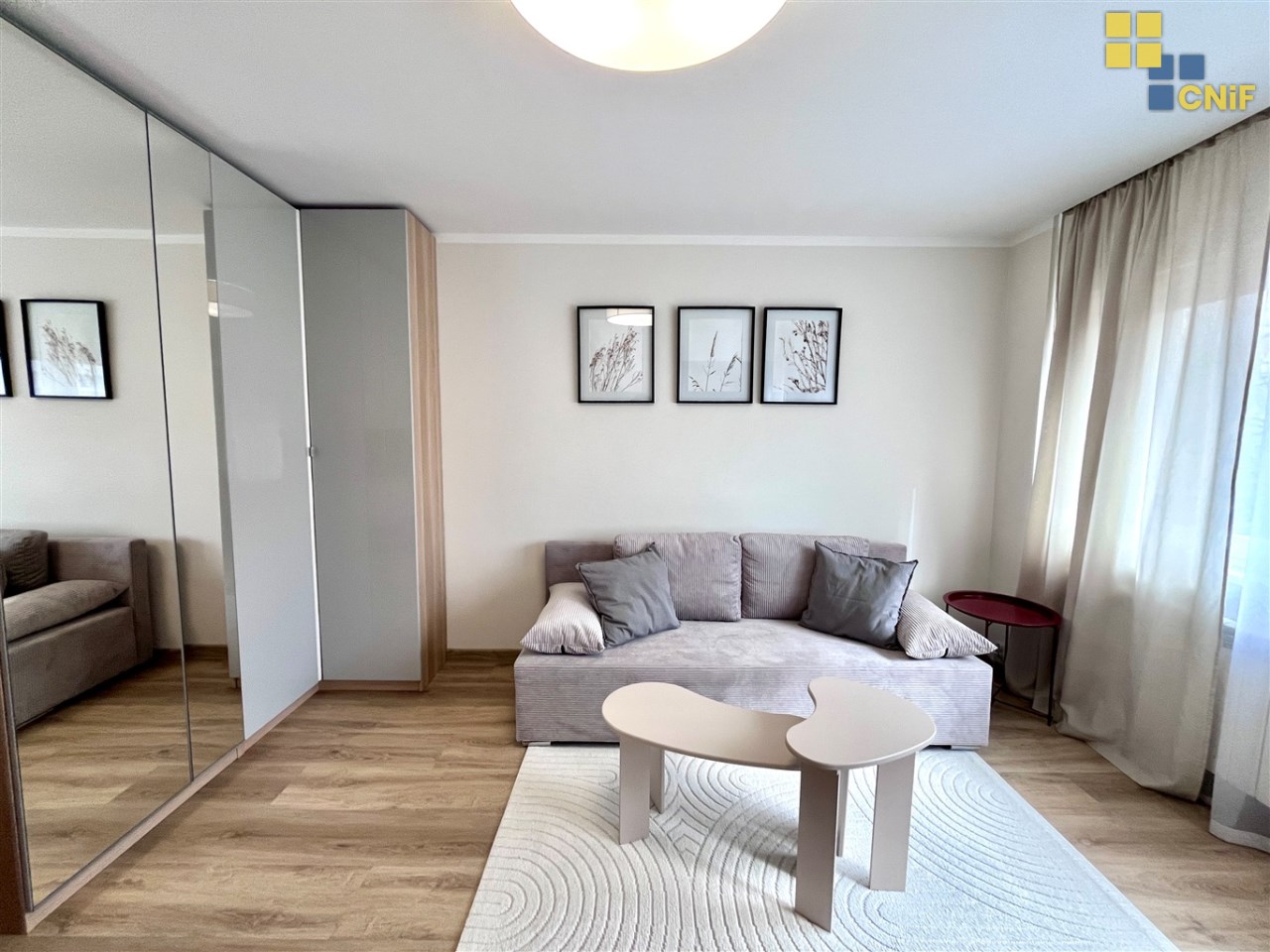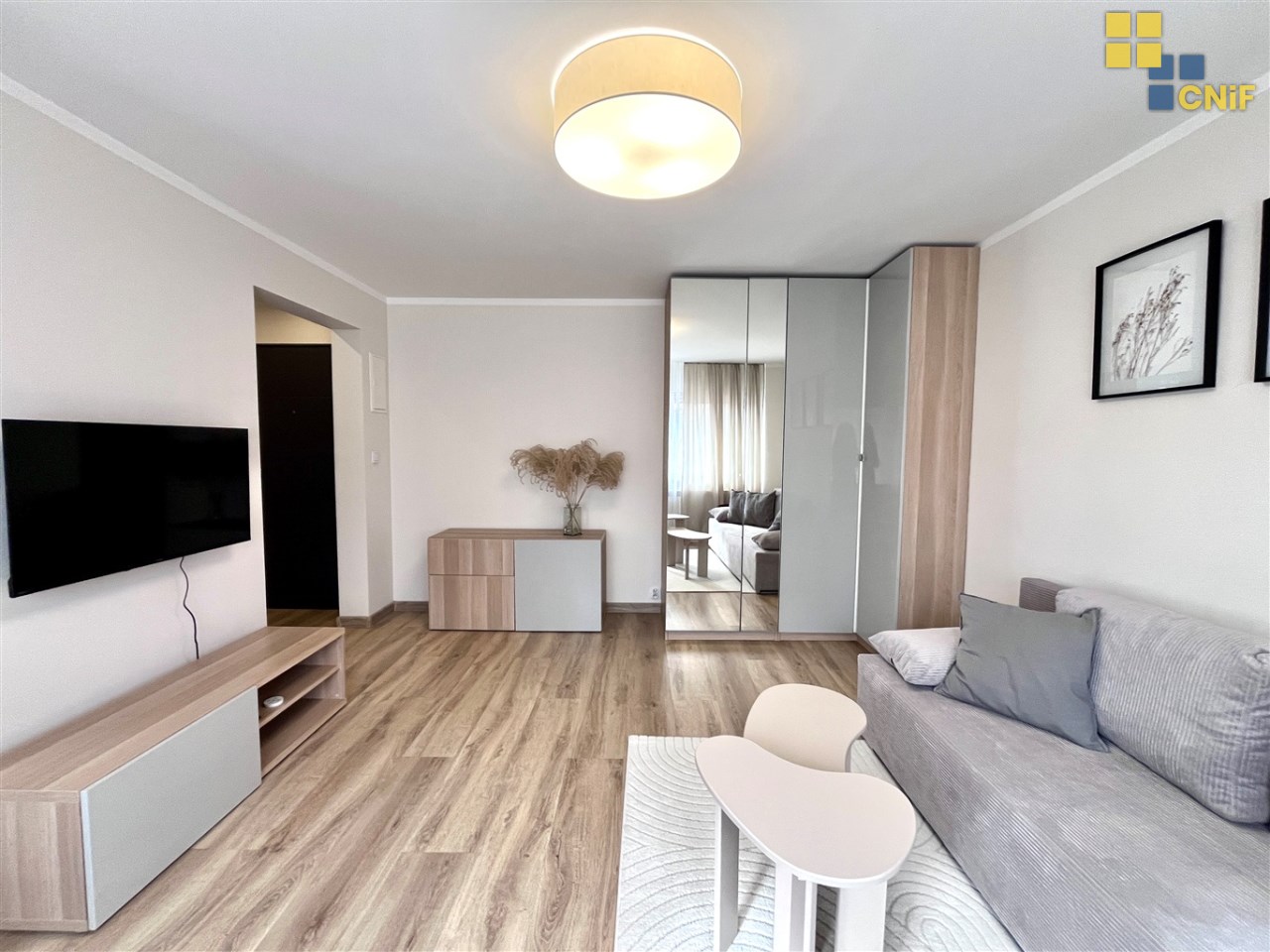 przestronnego, umeblowanego salonu wyposażonego w dużą szafę oraz rozkładaną sofę,