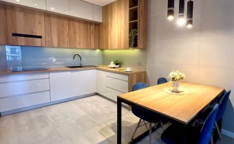 •    Salon z aneksem kuchennym – przestronny, jasny, z wyjściem na duży balkon, idealny do wypoczynku.