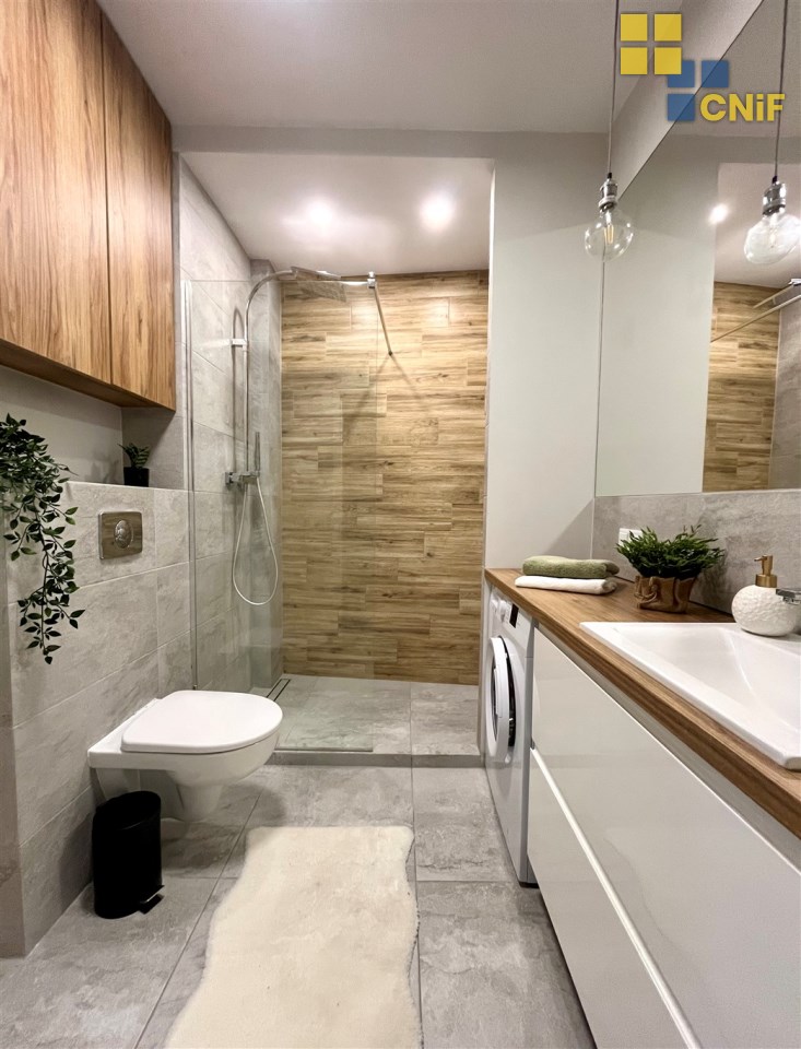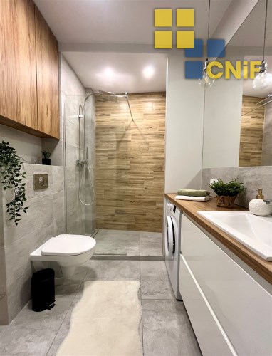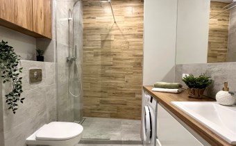 •    Łazienka – nowoczesna, z kabiną prysznicową i pralką.