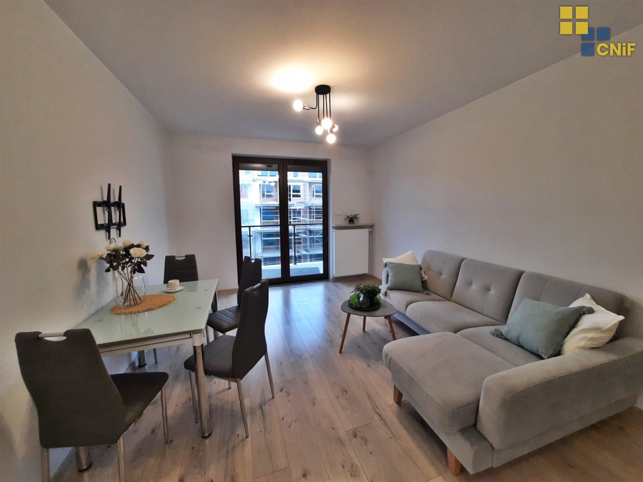 • Salon z aneksem kuchennym – przestronny, jasny, z wyjściem na duży balkon, idealny do wypoczynku.