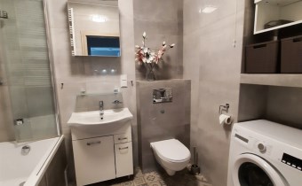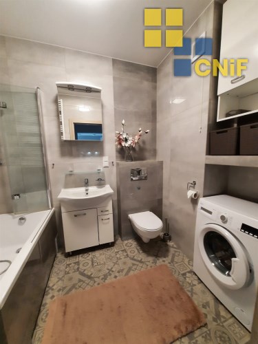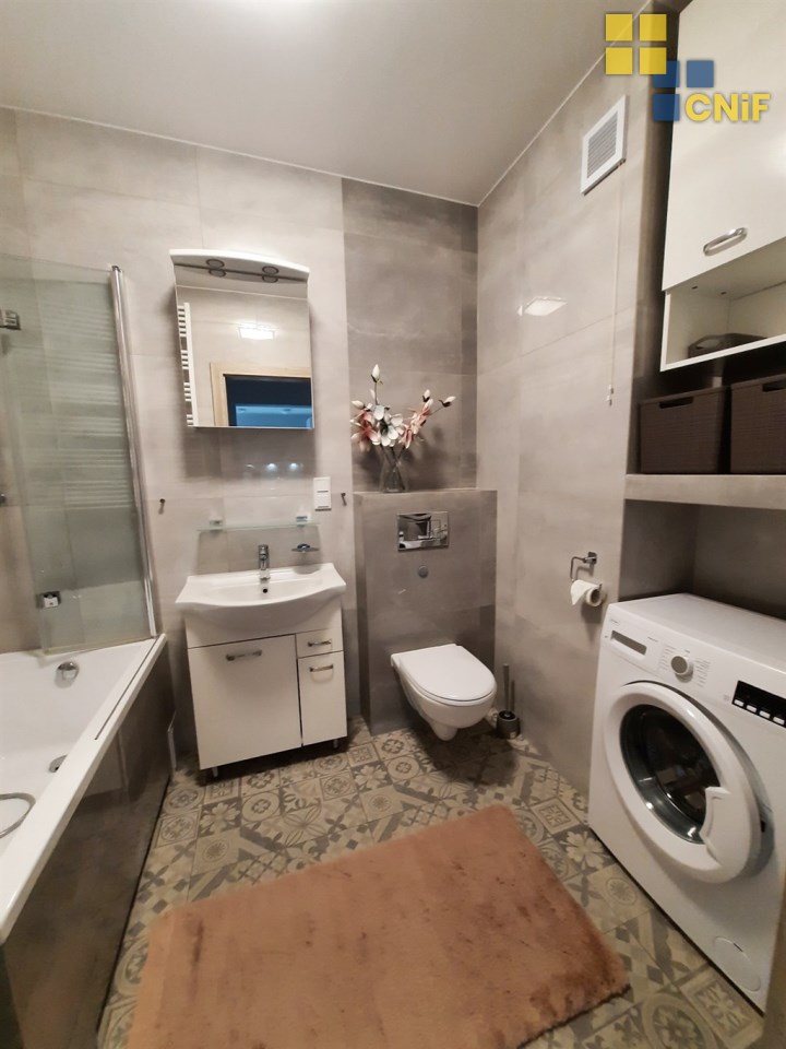 • Łazienka – nowoczesna, z kabiną prysznicową i pralką.